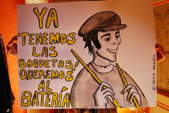 Ahora, había que continuar con la grupiada, Rams, se portó también como un caballero regalándonos las baquetas y aguantándome (se ha ganado el cielo), así que no podía ser menos. Mantendríamos la imagen de las caricaturas, y ¿el texto?, fue complicado, queríamos ser graciosas, a la vez que le impactara … así que tras muchas, muchas deliberaciones, quedó lo siguiente:
