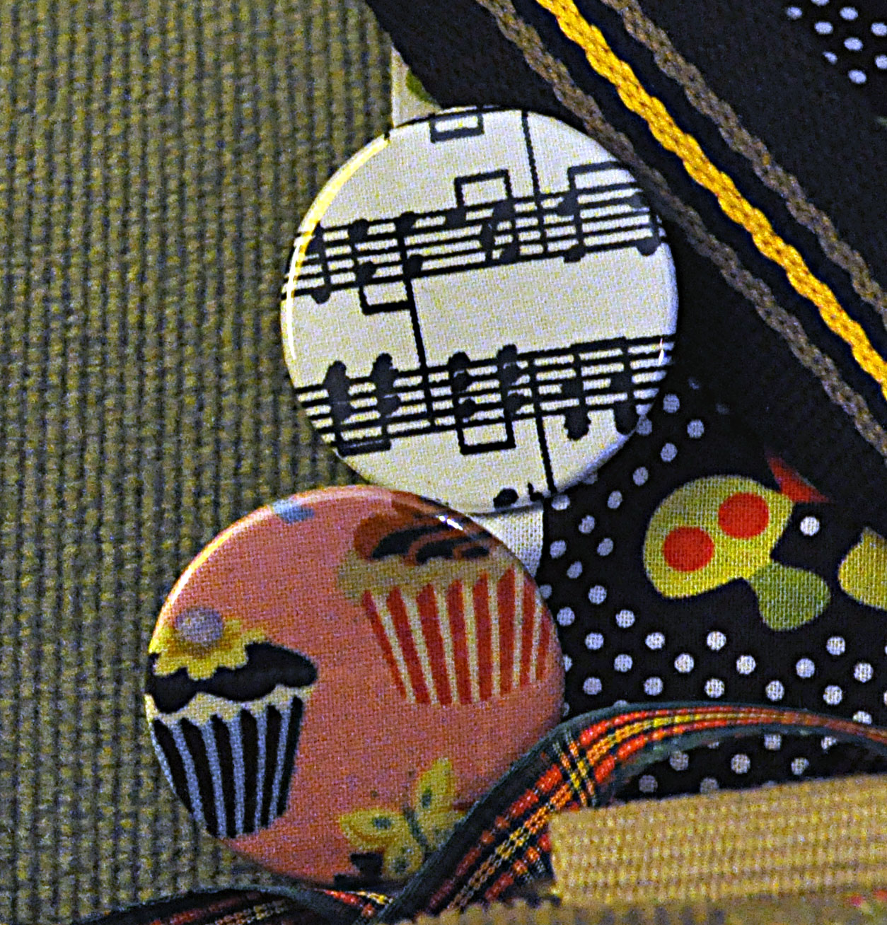 Además, como soy yo, amante de las chapas, no podrían faltar. Dos chapas que me definen: música y dulces. Por si me da por hacer manualidades nos encontramos con dos retales de tela: uno de helados y otro de retro-setas.  La bolsa amarilla es donde me han dado la compra, que es útil para llevar cualquier cosilla.