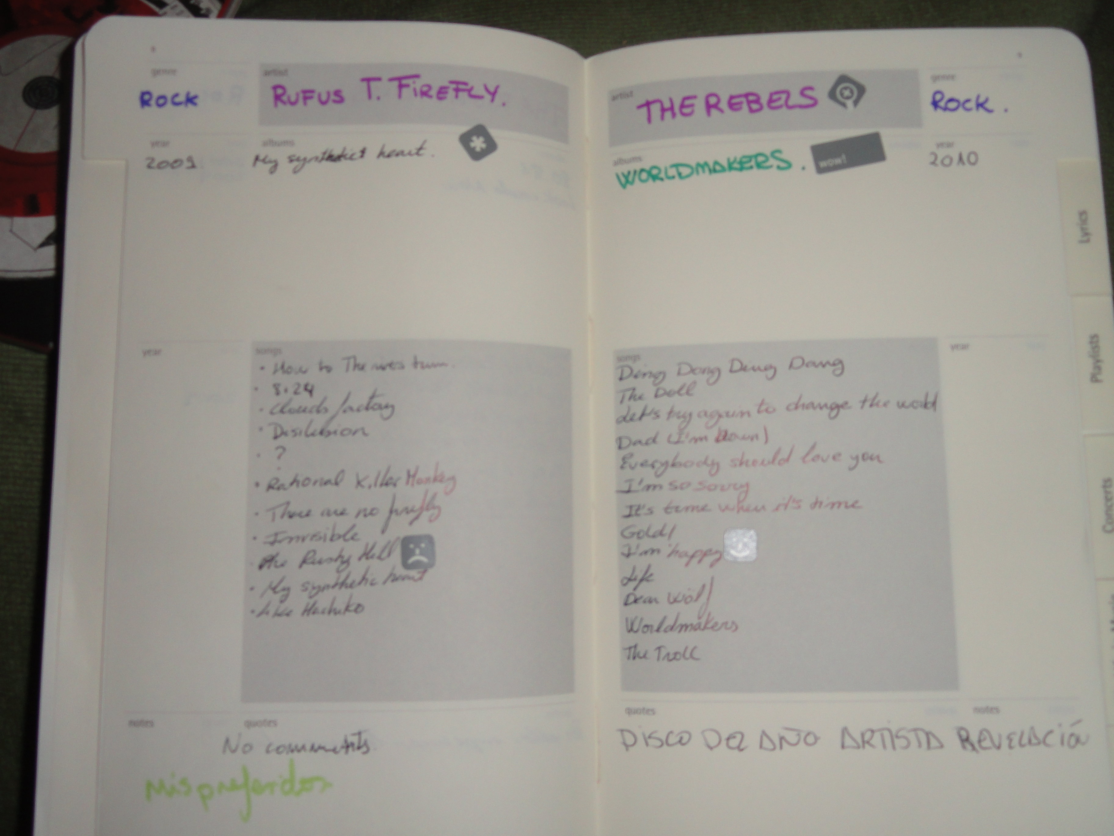 Esta agenda musical, se está transformando en mi pasión, ¿por qué? las hojas se acaban, por lo que hay que administrar muy bien el mismo, y saber qué se va a poner, aunque siempre que escribo en ella la pasión trepa por mi cabeza, y no puedo hacer un borrador, puesto que lo único que me sale son gilipolleces, pero eso es la esencia de la moleskine, que es bastante sincera.