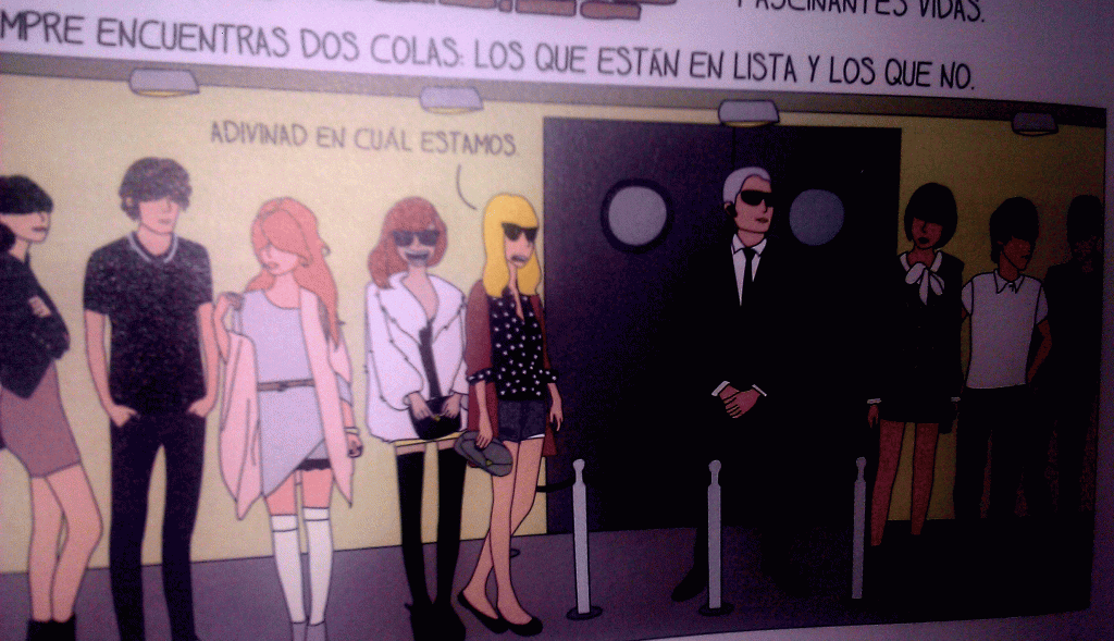 Esta es una viñeta fotografiada del cómic moderna de pueblo. Evidentemente esta podía ser la cola del Würtlizer, pues como era de esperar este viernes volvimos a dejarnos caer por ahí, y le pregunté a uno de los chicos que controlan la entrada ¿Cómo se puede llegar a ser VIP? – «Echándole morro, conocer a alguno de los que trabajamos aquí y que te pongan en lista o viniendo en días de diario o un domingo».  :S