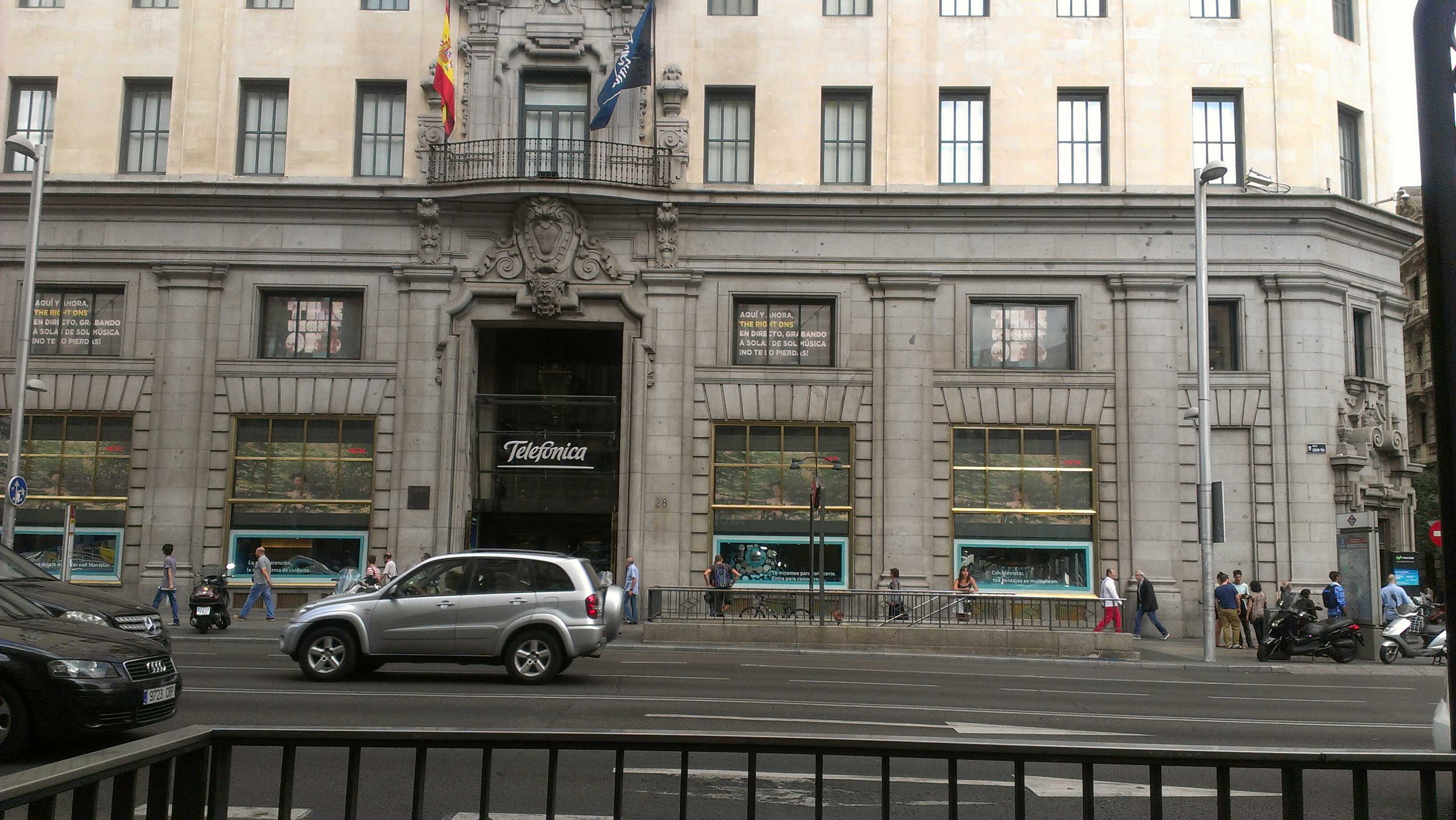 Fuimos a ese edificio que tiene telefónica en toda la Gran vía, durante estos días se ha podido ver la promo y sus dos videoclips en loop de manera continua. Por la noche molaba más.